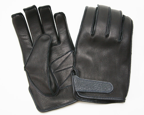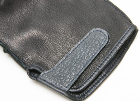 基本パターンは屋島工房おなじみのガンカット。操作する面に極力縫い目の来ないパターンになっています。遊び心として、ベルトはサメ革を用いました。気仙沼産のサメからゴツゴツした鱗を取ったもので、その強靭さは牛革に劣るものではありません。濃紺に染めたサメ革は、黒一色のバイクグローブにアクセントを与えてくれます。
