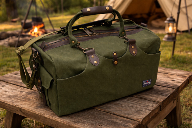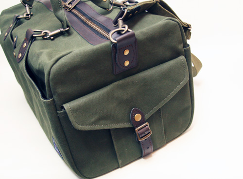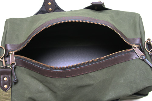 緑色をした生地は、屋島工房おなじみのパラフィン(蝋による撥水)加工をした帆布生地。素材は綿でありながらも、自衛隊御用達のお墨付きをもらった強靭な材料です。綿ならではの肌触りと、使い込むほど魅力が増すエイジングが楽しい素材でもあります。