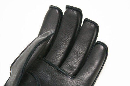 基本パターンは屋島工房おなじみのガンカット。操作する面に極力縫い目の来ないパターンになっています。遊び心として、ベルトはサメ革を用いました。気仙沼産のサメからゴツゴツした鱗を取ったもので、その強靭さは牛革に劣るものではありません。濃紺に染めたサメ革は、黒一色のバイクグローブにアクセントを与えてくれます。