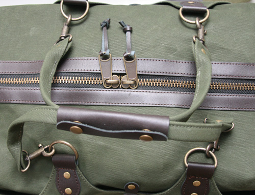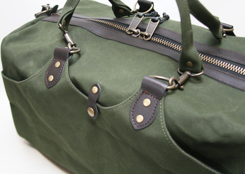 緑色をした生地は、屋島工房おなじみのパラフィン(蝋による撥水)加工をした帆布生地。素材は綿でありながらも、自衛隊御用達のお墨付きをもらった強靭な材料です。綿ならではの肌触りと、使い込むほど魅力が増すエイジングが楽しい素材でもあります。